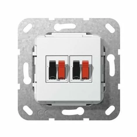 Gira Einsatz Lautsprecheranschluss 2fach Reinweiß glänzend Merkmale: – Frontseitiger Anschluss: Steckklemmen, rot schwarz. – Rückseitiger Anschluss: Schraubklemmen. Hinweise : – Nur für Schraubbefestigung. – Achtung! Bauraum für Stecker und Biegeradien beachten. – Bei Einsätzen mit Kupplungen beachten: Nicht für Kanalinstallation und Standard-Gerätedose geeignet. Anschluss mit Winkelsteckern empfohlen. – Installationsempfehlung: Kaiser Elektronic-Dosen Unterputz-Montage: Kaiser Best.-Nr.: 1068-02 Hohlwandmontage: Kaiser Best.-Nr.: 9062-94 Betoninstallation: Kaiser Best.-Nr.: 1268-40