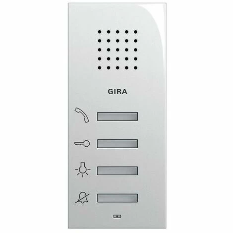 Gira Wohnungsstation AP System 55 Reinweiß glänzend Merkmale: – Komplett vormontierte Wohnungsstation AP. Dadurch schnelle und saubere Montage möglich. – Designvielfalt durch Integration in das Schalterprogramm, dadurch einheitliches Erscheinungsbild von Türkommunikation und Elektroinstallation. – Montage sowohl mit als auch ohne Abdeckrahmen. – Einfache Montage durch steckbare Schraubklemmen auf der Montageplatte. Die Kontaktierung zur Wohnungsstation erfolgt beim Aufstecken der Wohnungsstation auf die Montageplatte. – Einfache Demontage der Wohnungsstation bei Renovierungsarbeiten. – Befestigungslöcher für die Montage. – Signalübertragung und Versorgung der Wohnungsstation über verpolungssicheren und kurzschlussfesten 2-Draht-Bus. – Parallelschaltung von bis zu drei Wohnungsstationen möglich (bei Spannungsversorgung über 2-Draht-Bus). – Einmann-Inbetriebnahme durch einfache Inbetriebnahme-Prozedur. – Ruftonunterscheidung zwischen Türruf, Internruf und Etagenruf. – Auswahl von fünf verschiedenen Rufmelodien, die einzelnen Ruftasten individuell zugeordnet werden können. – Freisprechfunktion (sprachgesteuertes Gegensprechen mit Echo- und Hintergrund-geräuschunterdrückung). – Durchsetzfunktion bei lauten Hintergrundgeräuschen während der Sprechverbindung. – Mithörsperre. – Bedientasten mit integrierten Leuchtdioden zur Zustandsanzeige. Die Bedientasten der Wohnungsstation AP steuern die folgenden Funktionen in Verbindung mit dem Schaltaktor oder dem Unterputz-Schaltaktor:: – Schalten von Licht und anderen Funktionen. – Ansteuerung des Türöffners. – Einstellen der Rufmelodie. – Rufton ein- und ausschalten. – Rufannahme. – Aktivierung der Durchsetzfunktion. – Einstellung von Rufton- und Sprechlautstärke. Hinweise : – Montage ohne Abdeckrahmen möglich. – Bei Montage in Verbindung mit System 55 oder den Schalterprogrammen Flächenschalter und Gira E22 ist ein Abdeckrahmen 2fach ohne Mittelsteg erforderlich. – Bei der Montage auf eine Gerätedose ist ein Abdeckrahmen erforderlich – Mit dieser Komponente ist der Aufbau von Türkommunikationsanlagen mit bis zu 70 Teilnehmern möglich (z. B. 1 x Einbaulautsprecher, 5 x Erweiterungsmodul für