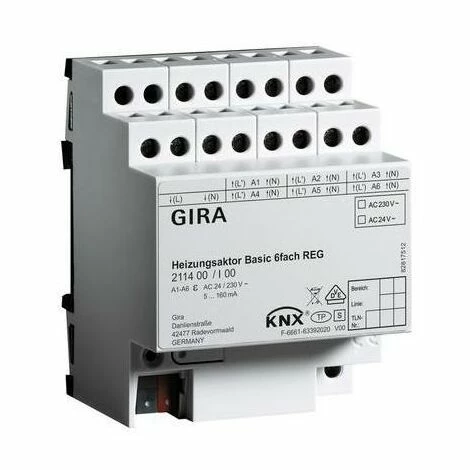 Gira KNX Heizungsaktor Basic 6fach REG plus Merkmale: – Heizungsaktor zum Schalten elektrothermischer Stellantriebe für Heizungen oder Kühldecken. – Ansteuerung über 1 Bit- oder 1 Byte-Stellgrößentelegramme. – Bei 1 Byte-Stellgrößen werden die Ausgänge durch eine Pulsweitenmodulation (PWM) angesteuert. – Stellantriebe mit Charakteristik stromlos geöffnet oder stromlos geschlossen ansteuerbar. – Stellantriebe mit Nennspannung 24 V oder 230 V ansteuerbar. – Überlastsicher, kurzschlusssicher. – Standardschutz. – Rückmeldung über Bus z. B. bei Überlast und Kurzschluss. – Schalten der Heizkreispumpe (Standardfunktionen). – Passive Sammelrückmeldung der angeschlossenen Stellantriebe. Hinweise : – An allen Ausgängen müssen Ventile mit der gleichen Betriebsspannung angeschlossen werden. – VDE-Zulassung gemäß EN 60669-1, EN 60669-2-1. –