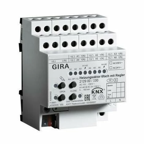 Gira KNX Heizungsaktor 6fach mit Regler REG plus Merkmale: – Heizungsaktor mit integriertem Raumtemperaturregler zum Schalten elektrothermischer Stellantriebe für Heizungen oder Kühldecken. Ventilausgänge: – Schaltbetrieb oder PWM-Betrieb. – Stellantriebe mit Charakteristik stromlos geöffnet oder stromlos geschlossen ansteuerbar. – Stellantriebe mit Nennspannung 24 V oder 230 V ansteuerbar. – Baustellenbetrieb: Ausgänge manuell bedienbar ohne Busspannung nur mit der Betriebsspannung. – Rückmeldung bei Handbetätigung und im Busbetrieb. – Sperren einzelner Ausgänge per Hand oder Bus. – Überlastsicher, kurzschlusssicher, Fehlermeldung mit LED. – Schutz gegen festsitzende Ventile. – Zwangsstellung. – Unterschiedliche Sollwerte für Zwangsstellung oder Notbetrieb bei Busausfall für Sommer und Winter. – Zyklische Überwachung der Eingangssignale parametrierbar. – Rückmeldung über Bus z. B. bei Ausfall der Ventilspannung, Überlast und Kurzschluss. – Schalten der Heizkreispumpe in Abhängigkeit der Ventilzustände. – Sammelrückmeldung der angeschlossenen Stellantriebe. – Energiesparmodus zum Reduzieren des Energieverbrauchs des Heizungsaktors. Anwendung für Zeiträume (z. B. Sommer) wo kein Wärmebedarf zum Heizen besteht. – Aktivierung des Stellantriebs mit First-Open-Funktion bei der Erstinbetriebnahme. – Schnelle Inbetriebnahme durch globale Einstellung der Kanäle. – Kaskadierung mehrerer Heizungsaktoren. – Zurücksetzen von Fehlermeldungen über BUS. – Wärmebedarfsteuerung. – Betriebsstundenzähler pro Kanal. Raumtemperaturregler: – 6 unabhängige Regler. – Steuerung über individuelle Kommunikatiosobjekte für Ein- und Ausgänge. – Wahlweise interne Gruppenkommunikation zur individuellen Zuweisung der Reglerausgänge zu den Ausgangskanälen des Aktors. – Betriebsmodi: Komfort, Standby, Nacht und Frost- Hitzeschutz. – Jedem Betriebsmodus können eigene Temperatur-Sollwerte zugeordnet werden. – Konfiguration der Temperatur-Sollwerte wahlweise relativ (Ableitung aus Basis-Sollwert) oder absolut (unabhängige Solltemperaturen für jeden Betriebsmodus). – Komfortverlängerung durch Präsenztaste, Dauer parametrierbar. – Umschaltung der Betriebsmodi durch 1-Byte-Objekte gemäß der KNX Spezifikation oder durch bis zu 4 einzelne 1-Bit-Objekte. – Statusrückmeldungen konfigurierbar. – Frost- Hitzeschutz-Umschaltung durch Fensterstatus oder durch Frostschutz-Automatik. – Betriebsarten Heizen, Kühlen, Heizen und Kühlen jeweils mit oder ohne Zusatzstufe. Die Temperatur-Sollwerte für die Zusatzstufe leiten sich durch einen parametrierbaren Stufenabstand aus den Werten der Grundstufe ab. – Je Heiz- oder Kühlstufe sind verschiedene Regelungsarten konfigurierbar: PI-Regelung (stetige oder schaltende PWM) oder 2-Punkt-Regelung (schaltend). – Regelparameter für PI-Regler (falls gewünscht: Proportionalbereich, Nachstellzeit) und 2Punkt-Regler (Hysterese) einstellbar. – Automatisches oder objektorientiertes Umschalten zwischen Heizen und Kühlen. – Raumtemperaturmessung über bis zu zwei externe KNX Temperaturfühler. Abgleich der Temperaturwerte möglich und Messwertbildung der externen Fühler parametrierbar. Abfragezeit der extern empfangenen Temperaturwerte einstellbar. – Die Ist- und Soll-Temperaturen können nach einer parametrierbaren Abweichung auf den Bus (auch zyklisch) ausgegeben werden. – Getrennte oder gemeinsame Stellgrößenausgabe im Heiz- und Kühlbetrieb. Dadurch ein oder zwei Stellgrößenobjekte je Stufe. – Normale oder invertierte Stellgrößenausgabe. – Automatisches Senden und Zykluszeit für Stellgrößenausgabe parametrierbar. – Stellgrößenbegrenzung möglich. – Fußbodentemperaturbegrenzung im Heizbetrieb möglich. – Solltemperaturbegrenzung im Kühlbetrieb möglich. Hinweise : – An allen Ausgängen müssen Ventile mit der gleichen Betriebsspannung angeschlossen werden. – VDE-Zulassung gemäß EN 60669-1, EN