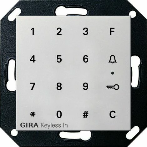 Keyless InCodetastatur System 55 Reinweiß glänzend Codetastatur als Zutrittskontrollsystem basierend auf einem kapazitiv wirkenden und damit verschleißfreien Tastenfeld.Die Codetastatur hat folgende Produktmerkmale: -Installation in der 58er Unterputzdose. -Kapazitives Tastenfeld. Zur Codeeingabe ist eine leichte Annäherung bzw. Berührung der Ziffer ausreichend. Aufgrund der verschleißfreien kapazitiven Technologie keine erkennbaren Abnutzung häufig benuzter Ziffernkombination. -Ermöglicht als Stand-Alone-Gerät oder in Kombination mit dem Gira Türkommunikations-System eine komfortable Ansteuerung zur Türöffnung für berechtigte Personen sowie ein Türrufsystem für Gebäude mit mehreren Wohneinheiten. -Beim Stand-Alone-Betrieb werden die im UP-Einsatz vorhandenen potentialfreien Relaiskontakte für die Schalthandlungen genutzt, z.B. für Türöffner mit eigener Spannungsversorgung (z.B. handelsüblicher Klingeltrafo). -Sondertaste C: Löschen einer Falscheingabe. -Sondertaste Schlüssel: Nach Eingabe des richtigen Codes erfolgt bei Tastenbetätigung eine direkte Türöffnung. -Sondertaste Glocke: Gezielte Anwahl von Wohnungsstationen in großen Objekten. -Sondertaste F: In Verbindung mit Schaltaktoren 121100, 128900 des Gira Türkommunikations-Systems sind hiermit Schaltfunktionen möglich. -Integration in das Gira Türkommunikations-System ohne weitere Systemkomponenten. -Inbetriebnahme durch Direkt-Konfiguration am Gerät möglich – die Codetastatur wird ohne PC oder Programmiersoftware in Betrieb genommen. -Homogene blaue LED-Ausleuchtung der Ziffern und Sonderzeichen bei Nacht. -Designvielfalt durch Integration in die Gira Designplattformen TX_44, System 55. Integration in Flächenschalter und Edelstahl Serie 20, Serie 21 über Adapterrahmen möglich. -Master PIN-Nummer auf beiliegender versiegelter Sicherheitskarte bei Verlust der Administrator-PIN-Nummer.