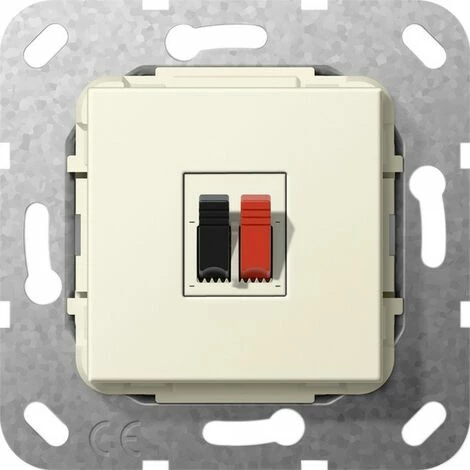 Einsatz Lautsprecheranschluss 1fach Cremeweiß glänzend Merkmale: Frontseitiger Anschluss: Steckklemmen, rot schwarz. Rückseitiger Anschluss: Schraubklemmen. Hinweise : Nur für Schraubbefestigung. Achtung! Bauraum für Stecker und Biegeradien beachten. Bei Einsätzen mit Kupplungen beachten: Nicht für Kanalinstallation und Standardgerätedose geeignet. Anschluss mit Winkelsteckern empfohlen. Bei Verwendung dieser Steckvorrichtungen besteht für angeschlossene Geräte eine Leistungsbegrenzung von 15 Watt. Installationsempfehlung: Kaiser Elektronic-Dosen Unterputz-Montage: Kaiser Best.-Nr.: 1068-02 Hohlwandmontage: Kaiser Best.-Nr.: 9062-94 Betoninstallation: Kaiser Best.-Nr.: 1268-40