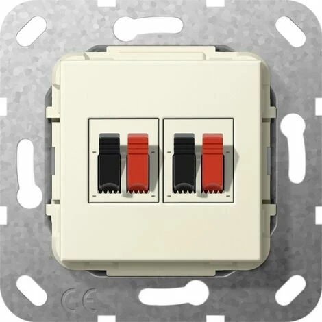 Einsatz Lautsprecheranschluss 2fach Cremeweiß glänzend Merkmale: Frontseitiger Anschluss: Steckklemmen, rot schwarz. Rückseitiger Anschluss: Schraubklemmen. Hinweise : Nur für Schraubbefestigung. Achtung! Bauraum für Stecker und Biegeradien beachten. Bei Einsätzen mit Kupplungen beachten: Nicht für Kanalinstallation und Standardgerätedose geeignet. Anschluss mit Winkelsteckern empfohlen. Bei Verwendung dieser Steckvorrichtungen besteht für angeschlossene Geräte eine Leistungsbegrenzung von 15 Watt. Installationsempfehlung: Kaiser Elektronic-Dosen Unterputz-Montage: Kaiser Best.-Nr.: 1068-02 Hohlwandmontage: Kaiser Best.-Nr.: 9062-94 Betoninstallation: Kaiser Best.-Nr.: 1268-40